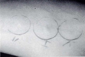 - Fig. 14 コラーゲン皮膚注入の皮膚テスト。陽性反応。