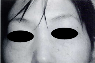 前額部中央の一番目立つ皺に対して左にZyderm®、右にRestylane®を注入した(Fig. 4, 5)。注入2週間後には皺は目立たなくなったが、Restylane®の注入部位に若干凹凸が認められた(Fig. 6)。なおこの症例は、患部の皺に対してコラーゲンとヒアルロン酸のどちらがより有効かを本人の希望によりテストしてみたいとの申し出により実施した。