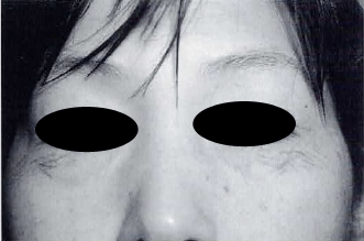 目尻や下眼瞼の皺の治療を希望してZyderm®とAtelocollagen®の皮内テストを実施した。しかし17日後に発赤、腫脹が認められた(Fig. 14)。そのため再度Zyderm®、Atelocollagen®、Restylane®の皮内テストを実施して、6か月経過観察したが、やはりZyderm®とAtelocollagen®は陽性反応を示した。そのうえで目尻と下眼瞼にRestylane®を少量注入した(Fig. 15, 16)。注入5週間後では目尻や下眼瞼の皺が減少したが、微妙な凹凸が残り照明の方向によっては目立った(Fig. 17)。