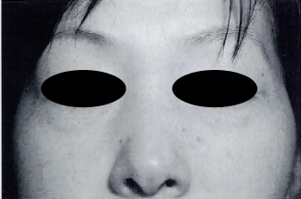 眉間と鼻唇溝にRestylane®を注入した。注入3週間後の診察において、眉間の皺は完全に消失したが、若干隆起が認められた(Fig. 10, 11)。また鼻唇溝はわずかに赤味があるが、皺は消失して平坦な状態になった(Fig. 12, 13)。